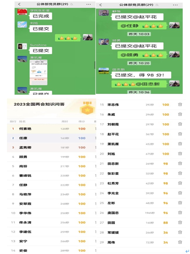 在全面贯彻党的二十大精神的开局之年,中国迎来了意义非凡的“两会”。为了深入学习两会精神,牢记育人使命,进一步加强best365官网公体党支部和党员队伍建设,不断提高广大党员深入践行党的二十大精神,公体党支部于2023年3月20日上午采用线上答题形式,开展两会知识问答主题党日活动,以此促进党员进一步了解两会精神,提升党员队伍的向心力和凝聚力。