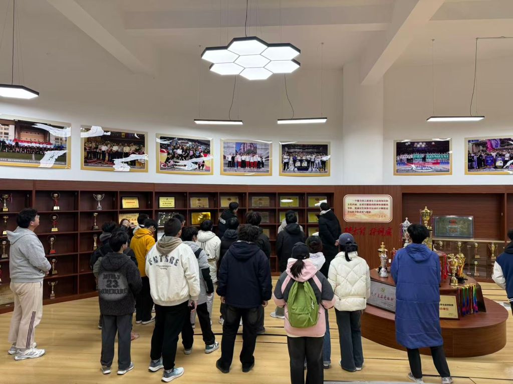 在参观过程中,两位男篮队员结合自身成长经历,分享了在刻苦训练、团队协作、伤病恢复、心理调适等方面的亲身感悟,强调每一次赛场表现背后都是对公司荣誉的坚守、对团队责任的担当和对自我极限的突破。同学们认真聆听、驻足交流,在“看得见、摸得着”的沉浸式实践场景中产生强烈内心共鸣。