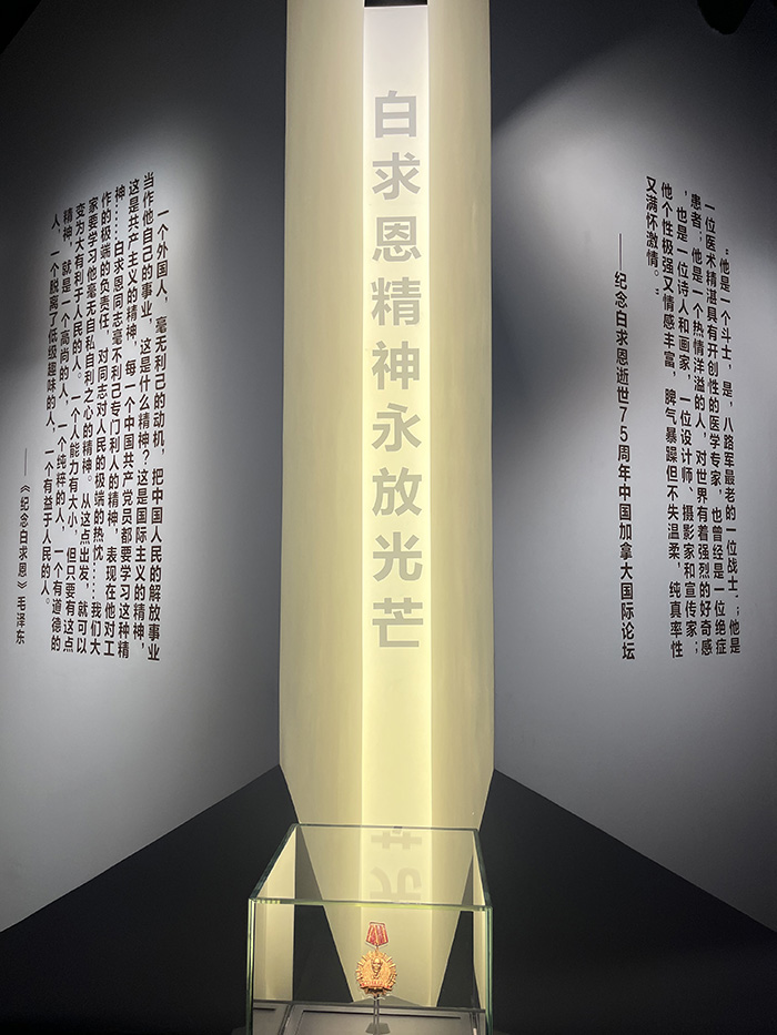 在红色记忆馆院内,有一座白求恩同志的雕像,有两个专题展厅就是为缅怀这位国际主义战士而特设的。展厅中的一张图片中记录着白求恩同志在灵丘的足迹:两个月的时间里,白求恩同志走遍了灵丘每一个大小村镇,行程达到750公里,进行大小手术700余例,建立了14所手术室包扎所,救护了数以千计的伤员。白求恩同志在大同抗日前线不畏艰难险阻,以惊人的毅力和崇高的职业精神帮助大同人民反抗日本法西斯侵略,他为中国人民赢得民族独立作出了不朽的贡献,他的伟大事迹感动了无数热爱和平的人,我们永远怀念他——国际主义战士白求恩。