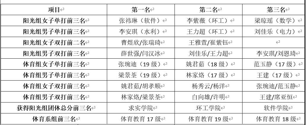 在为期两天的比赛中,运动员们充分展示了个人技能,享受着比赛的过程,通过比赛也结交了有共同爱好的朋友,积极推动了校园文化建设,为best365官方网站“双一流”建设贡献力量。最终比赛结果如下: