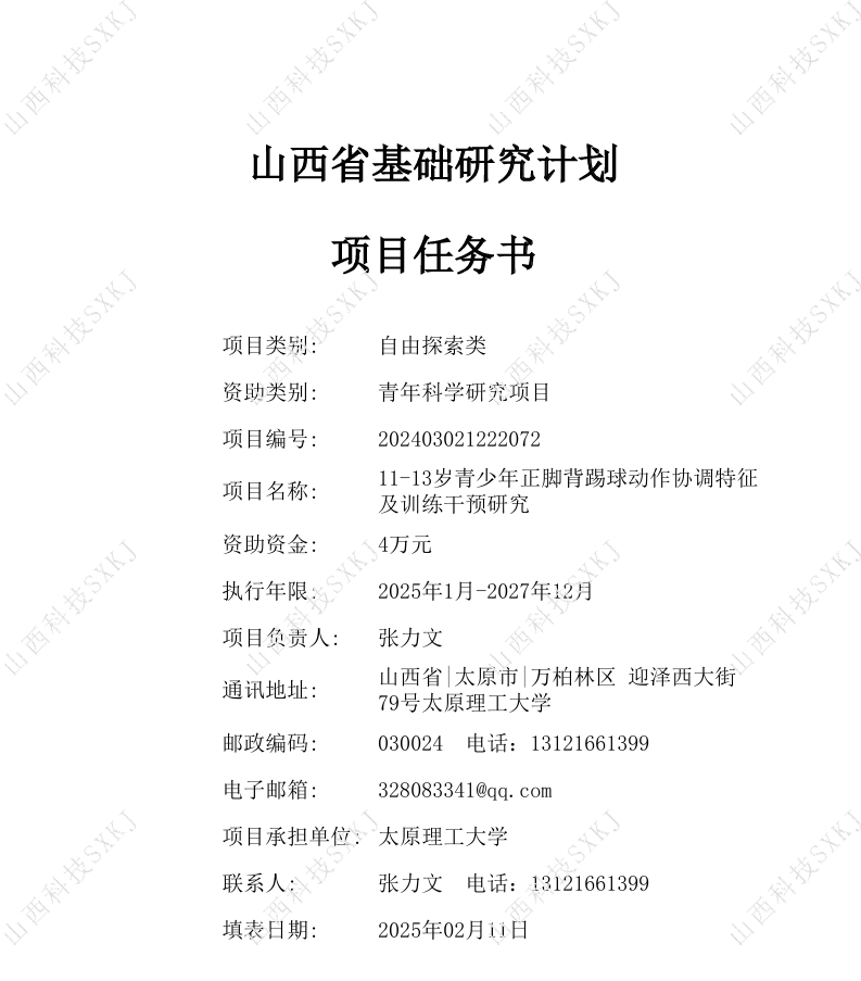 山西省基础研究计划(自由探索类)资助项目2024年度第二批资助项目公布,公司教师张力文申报的青年项目“11-13岁青少年正脚背踢球动作协调特征及训练干预研究”获得立项支持,科研进账经费4万元。