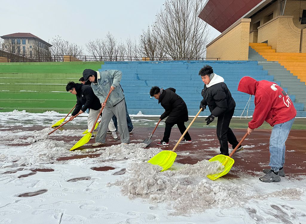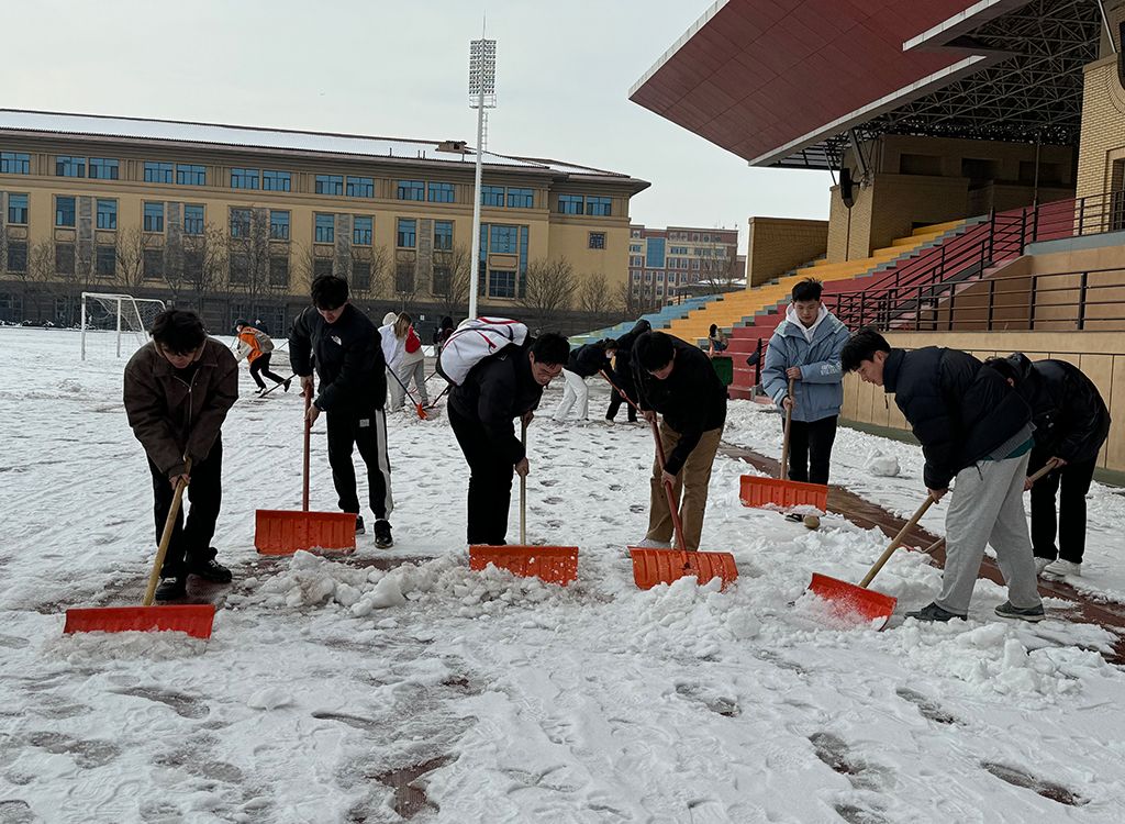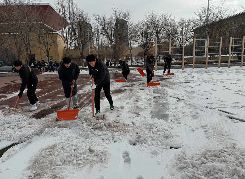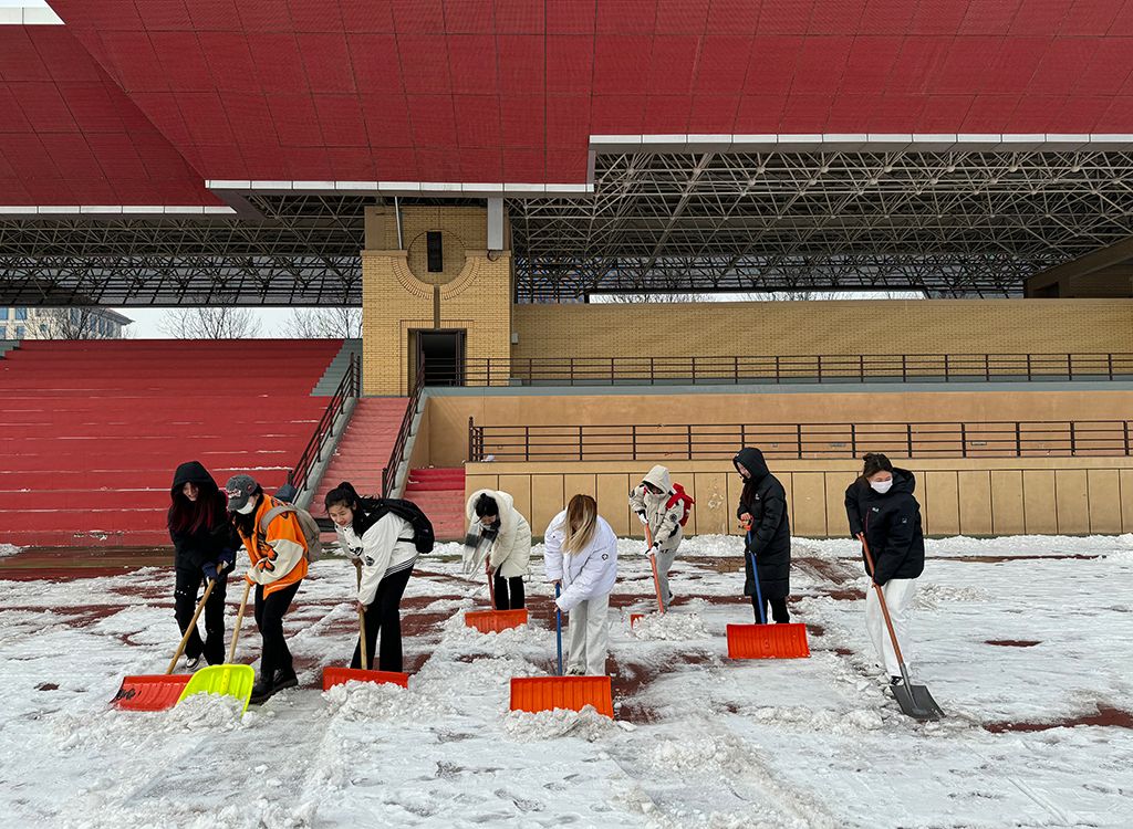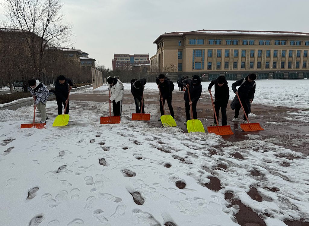 2月26日上午10点,best365官网团委副书记姜昆与青年志愿者们在东操场器材室前集合,带着专业冰雪扫除工具开始劳动。气温骤降、寒风凛冽,却丝毫没有挡住志愿者们的工作热情。大家拿起铁锹,干劲十足,齐心协力清扫操场上课跑道的积雪,皑皑白雪映衬着他们冻红的脸和双手,他们不畏严寒,躬着身子,抡起铁锹,挥舞雪铲,铲雪声打破了雪后的寂静,志愿者们的热情融化了冰雪。
