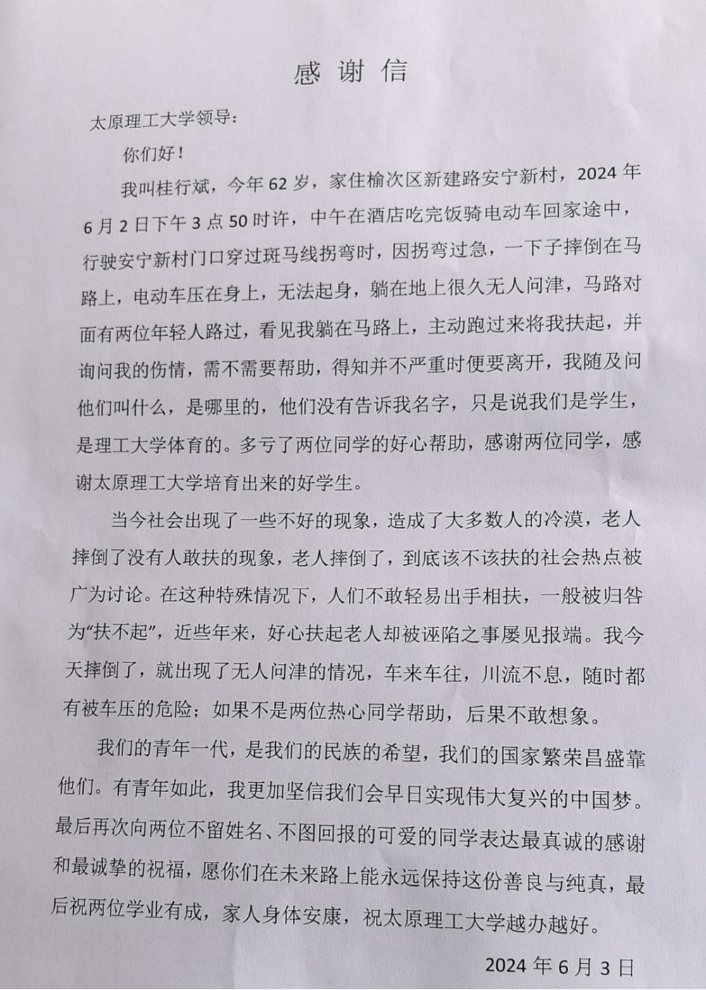 6月2日下午,一位六旬老人在晋中市榆次区安宁新村十字路口骑行时不慎摔倒,无法起身,best365官网青年员工李世航看见后连忙上前扶起老人,并查看和询问老人情况,确认老人并不严重后方才离开。事后,为了感谢这两位同学好心助人的善举,这位老人向公司送来感谢信,信里写出:“向两位不留姓名、不图回报的可爱的同学表达最真诚的感谢和最诚挚的祝福,愿你们在未来路上永远保持这份善良与纯真。”