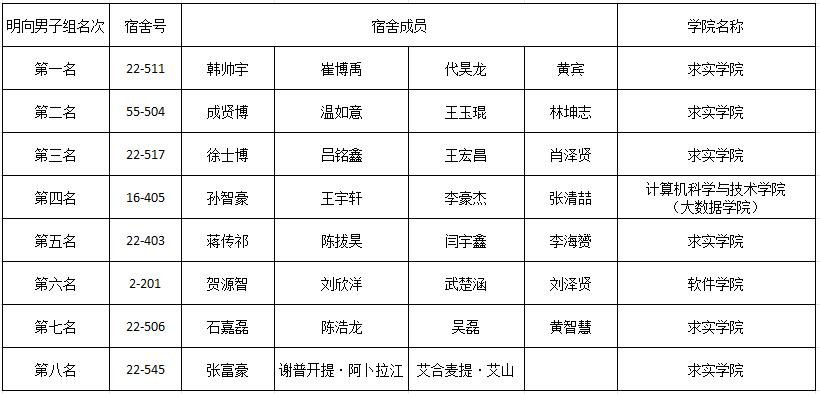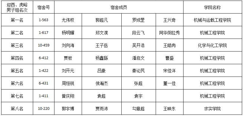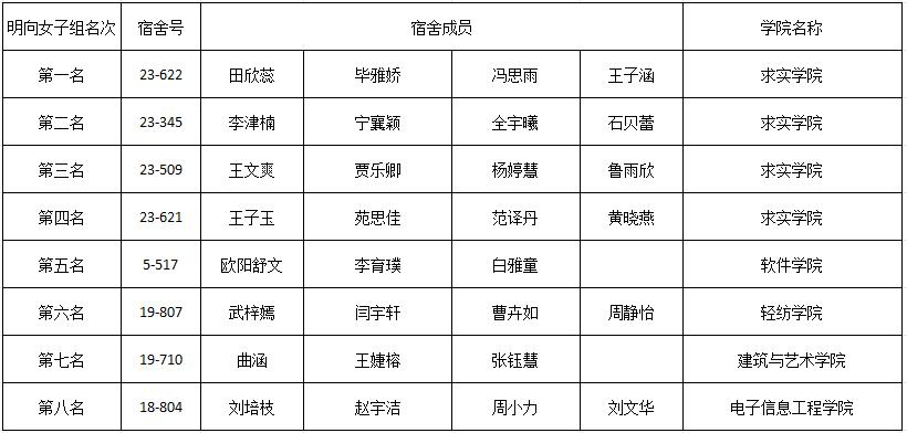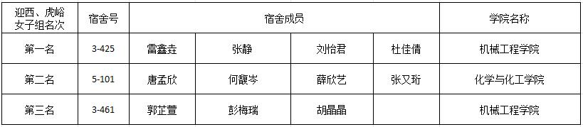 本次比赛采用双败淘汰制,各宿舍代表队运动员们自觉遵守比赛规则,听从指挥、服从裁判,在球场上顽强拼搏、不怕困难,抓住机会、奋力争先,充分展现了优秀的团队合作的体育精神。选手们在比赛中认真对待,积极拼抢、每球必争、比拼激烈,经过角逐各组别排名如下:
