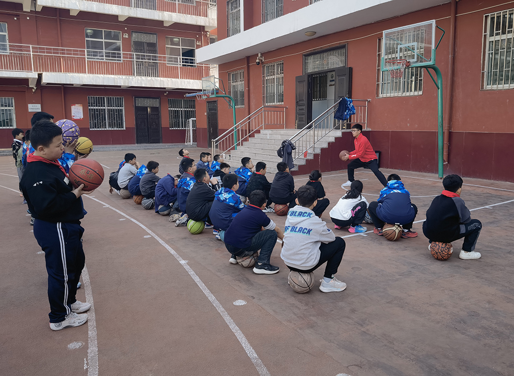 城关一小支教团队立足公司体育特色,创新组建篮球训练社团。基于青少年体能发展规律,开发了"五指贴标法"运球矫正体系:通过手掌标识可视化教学,将复杂的运球手型分解为直观动作模块。通过系统培训帮助本校教师掌握篮球教学技能,从基础动作分解、训练方法设计到课程组织进行全方位指导