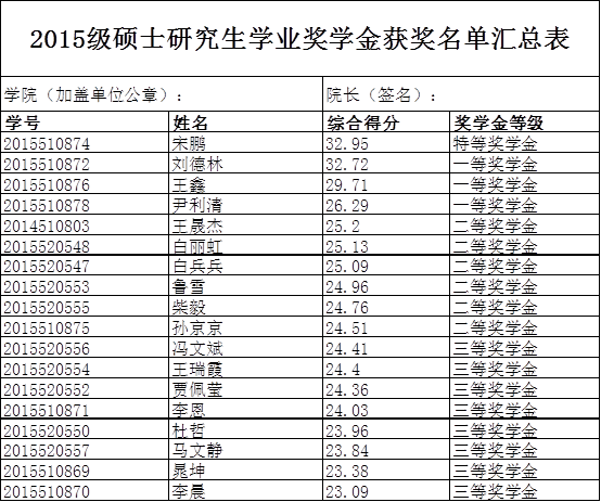2015级研究生三年级学业奖学金评审结果的公示