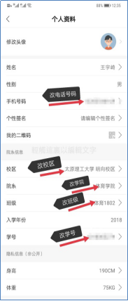 在注册中完善信息的时候,如果出现提示性别、院系或班级等信息跟自己的不一样,先点注册完成,注册完成后可以在我的-个人资料里修改院系及班级。如果出现性别错误联系,上报班长,班长汇总本班情况并联系APP负责人,进行更改。