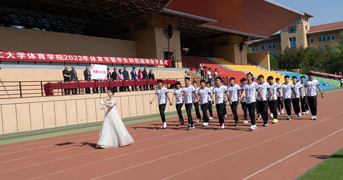 伴随着激昂的音乐,迈着矫健的步伐,体育教育、赛马、运动训练、高水平运动队和体育研究生以班级为单位组成的代表队逐一步入体育场并接受主席台检阅。方队队员们,喊着响亮的口号,精神饱满的经过主席台,赢得一阵阵热烈的掌声。沐浴着初夏的阳光,身着笔挺的军装,首先入场的是国旗方队,他们昂首阔步,代表着祖国的未来和希望。紧跟其后的高水平篮球队队长张凯飞为旗手、运动训练2022级女排和射箭运动员组成的院旗方队。体育教育田径、篮球专选的员工抬着“太理人生体育底色”的展板走向主席台,一个个身影步伐矫健,一张张年轻干净的脸上又散发出与之相衬的少年意气!他们自信与骄傲的姿态,仿佛在告诉我们:“这就是体育人,这就是体育生的朝气和青春!”