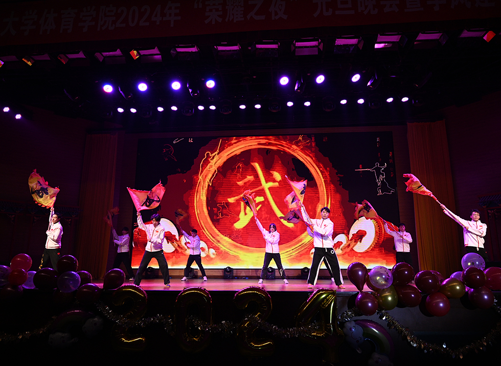 晚会现场灯光璀璨,乐声满堂,全场洋溢着和谐热烈的氛围。本次元旦晚会共分为“鼎故辞旧,青春激昂”、“体育健儿,盛会华章”、“奋楫笃行,扬帆起航”三个篇章,best365官网师生通过歌曲串烧、音乐剧、小品、影子剧、舞蹈、武术表演、艺术体操表演、健身健美表演等多种形式,为全院师生呈现了一场视觉与听觉的盛宴。