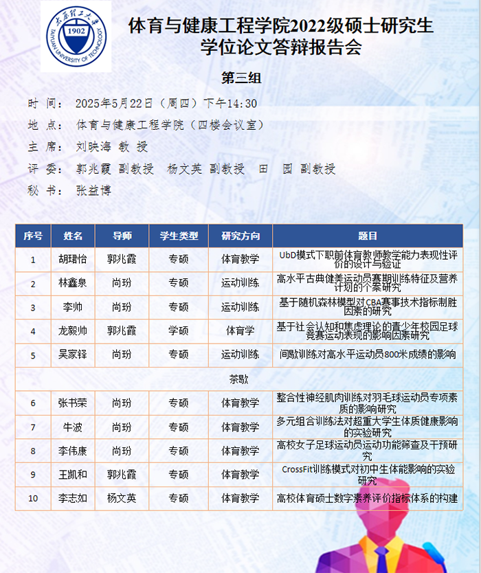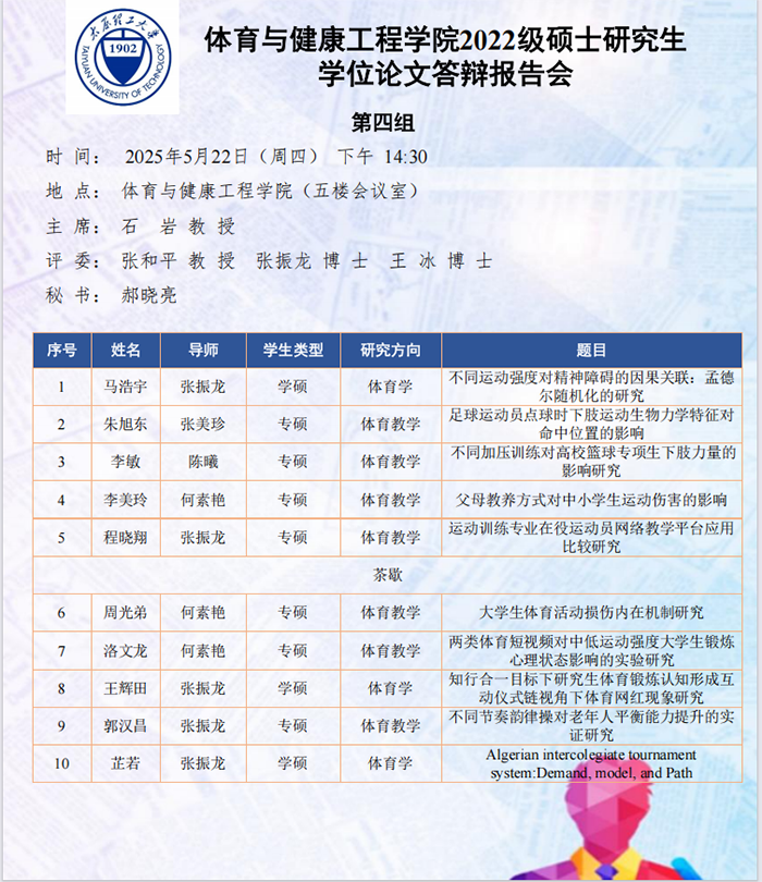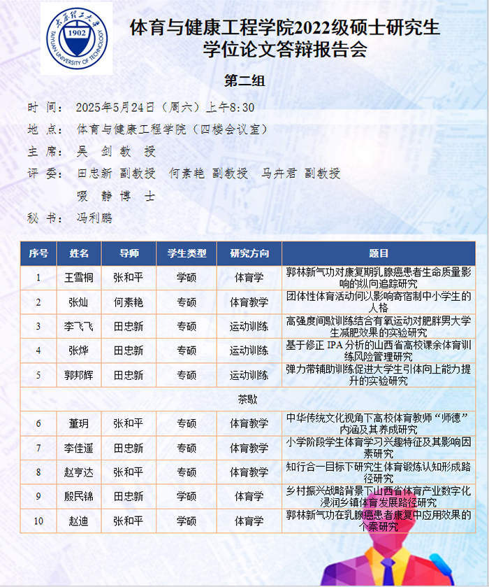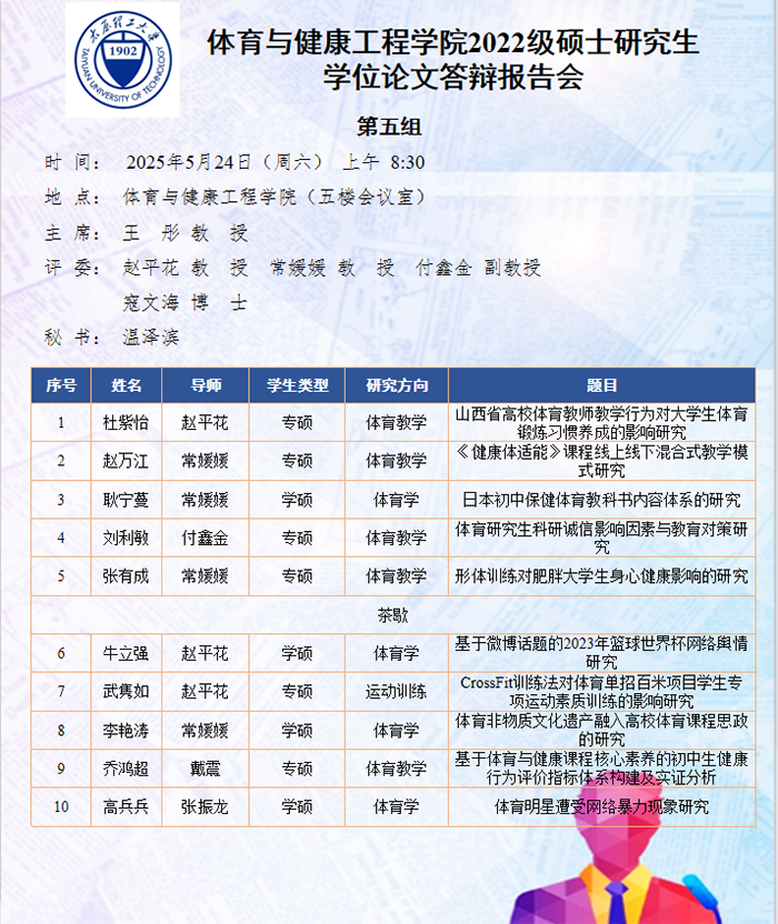 5月22日至25日,best365官网进行了2025届硕士研究生论文答辩报告会。根据研究方向,报告会分为5组进行,分别邀请校外专家山西师范大学郑旗教授、山西大学石岩教授、山西师范大学王彤教授、中北大学吴剑教授和山西大学刘映海教授担任答辩委员会主席,best365官网硕士研究生导师担任答辩委员会成员。