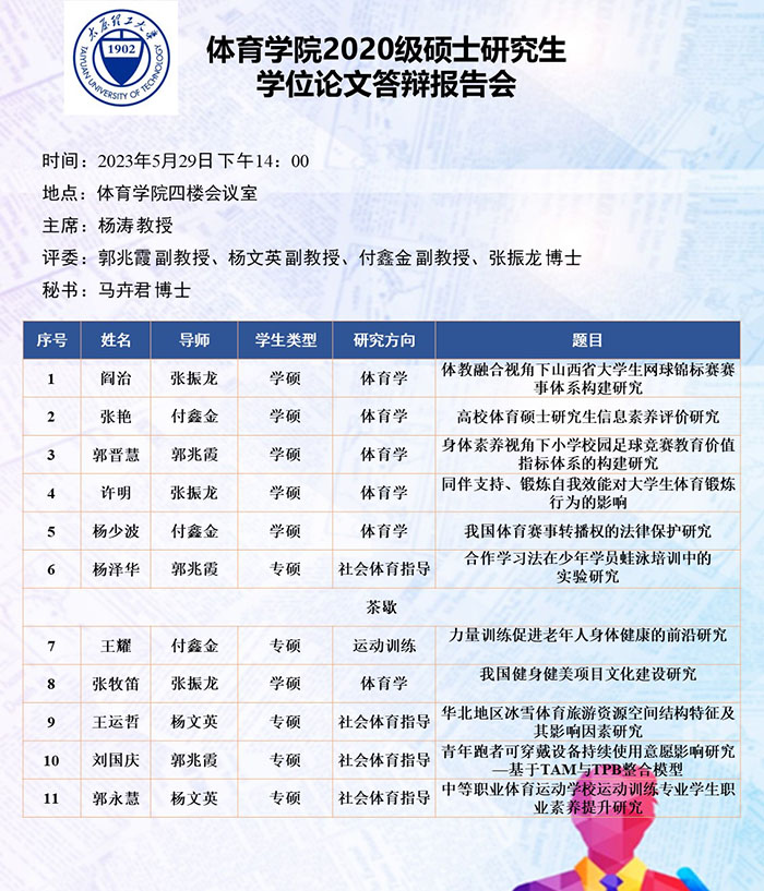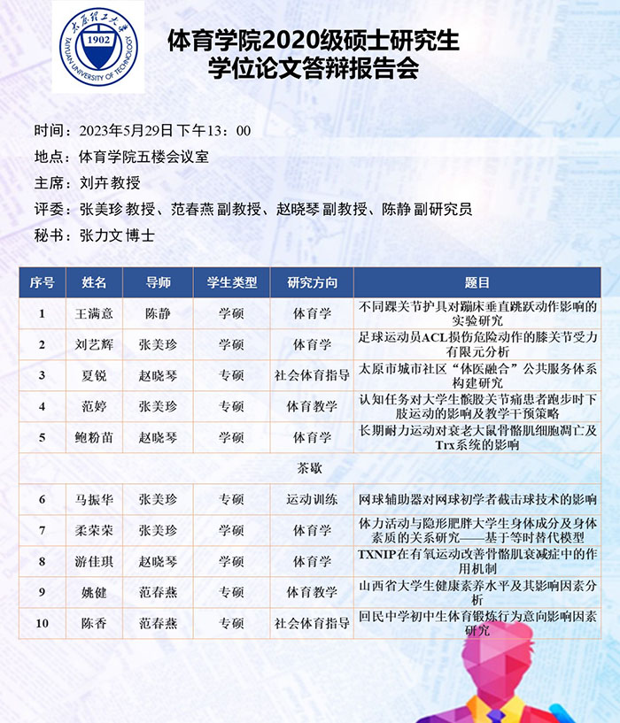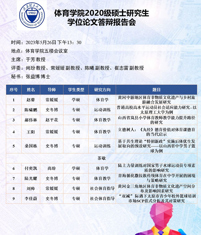 5月26日至30日,best365官网进行了2020级硕士研究生论文答辩报告会。根据研究方向,报告会分为4组进行,均邀请校外专家郑旗(教授,山西师范大学)、刘卉(教授,北京体育大学)、于芳(教授,中北大学)和杨涛(教授,西安best365官网)担任答辩委员会主席,best365官网硕士研究生导师担任答辩委员会成员。