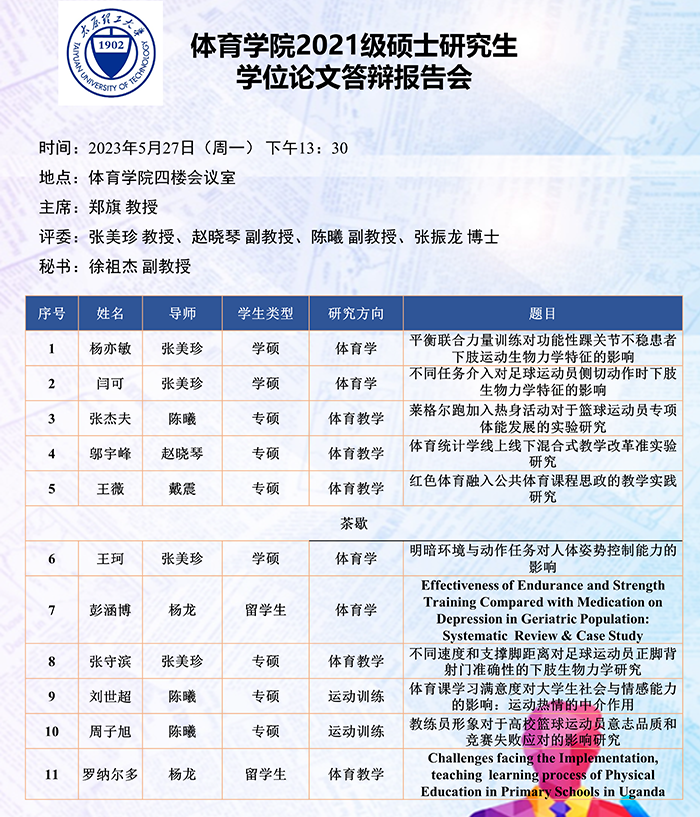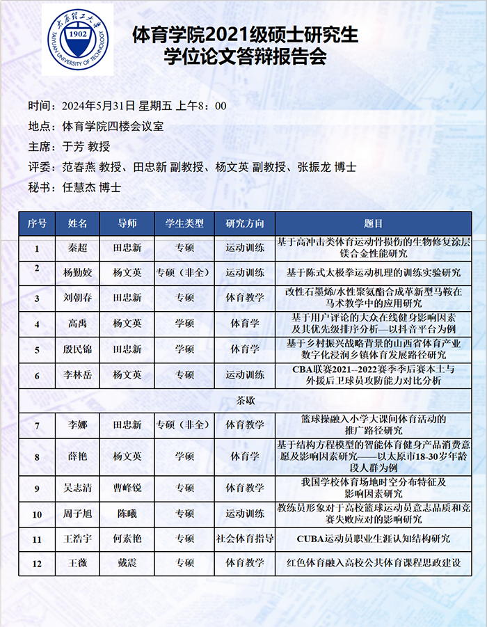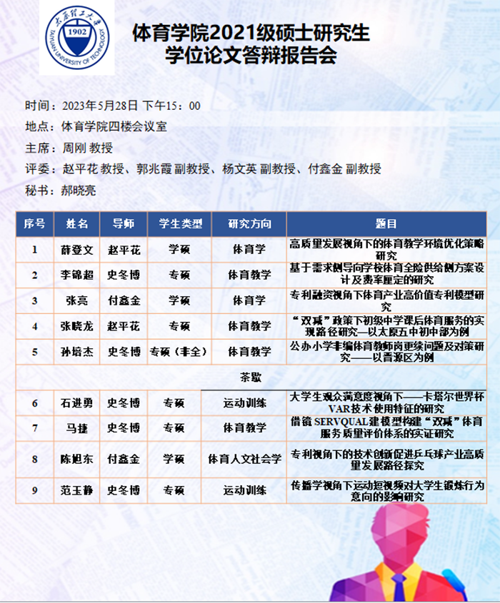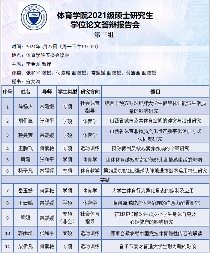 5月27日至31日,​best365官网进行了2024届硕士研究生论文答辩报告会。根据研究方向,报告会分为5组进行,均邀请校外专家郑旗(教授,山西师范大学)、吴剑(教授,中北大学)、于芳(教授,中北大学)、李金龙(教授,山西大学)和周刚(教研员,太原市教研科研中心)担任答辩委员会主席,​best365官网硕士研究生导师担任答辩委员会成员。