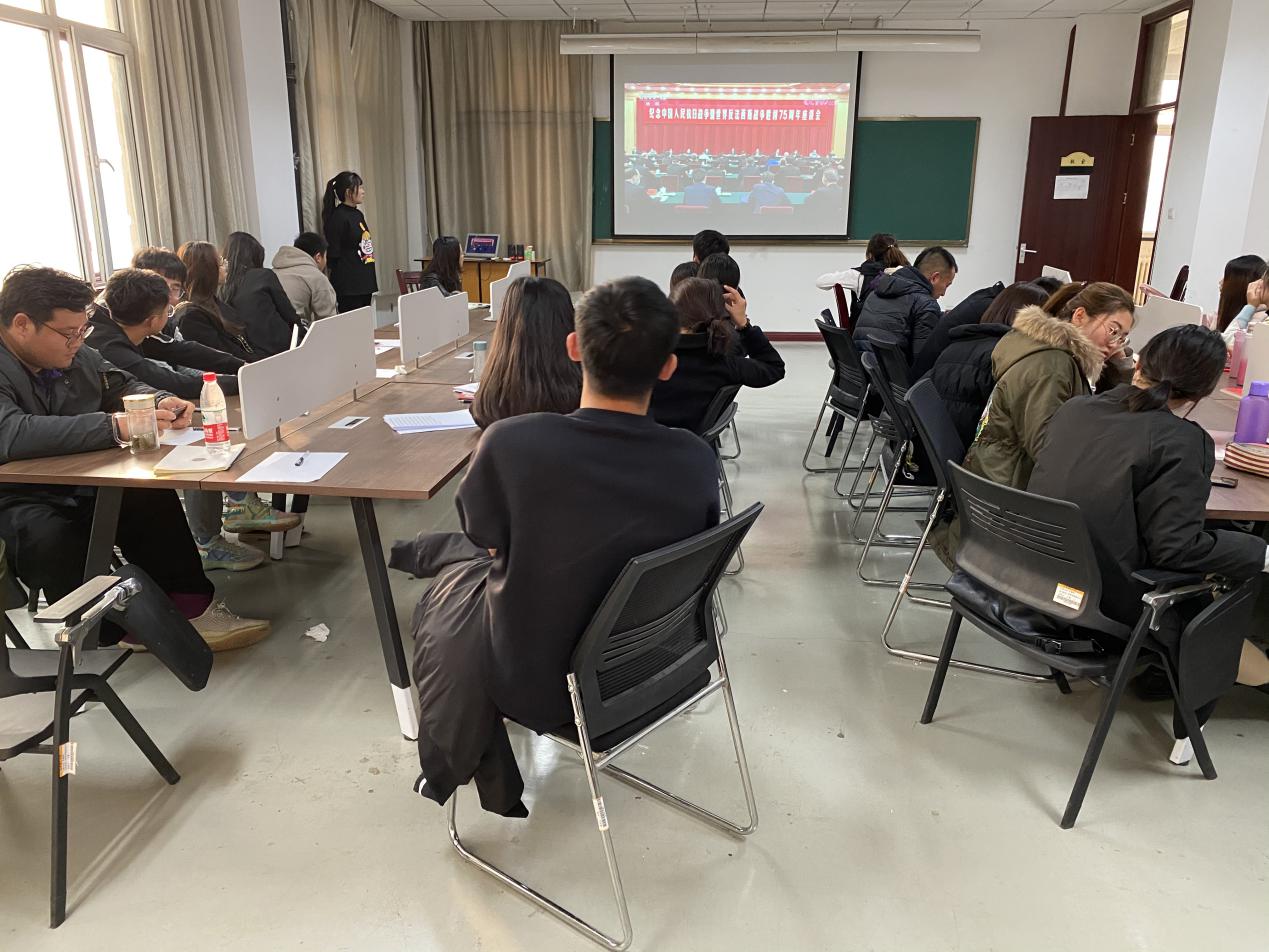 会议第三项由贾敏带领全体成员学习了“习近平在纪念中国人民抗日战争暨世界反法西斯战争胜利75周年座谈会上讲话”,号召所有人要更加紧密地团结起来,弘扬伟大抗战精神,向着中华民族伟大复兴的光辉彼岸奋勇前进。同学们也一致认为这是对为夺取中国人民抗日战争胜利献出生命的所有先烈、对为中华民族独立和中国人民解放献出生命的所有英灵的最好告慰。