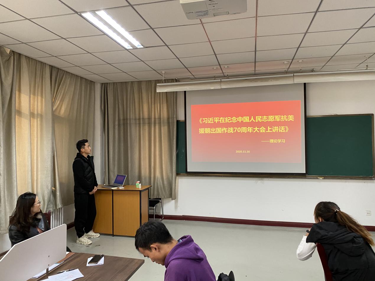 2020年11月16日,best365官网研究生党支部在best365官网503研究生教室开展了《习近平在纪念中国人民志愿军抗美援朝出国作战70周年大会上讲话》、“习近平在全国抗击新冠肺炎疫情表彰大会上的讲话”以及“习近平在纪念中国人民抗日战争暨世界反法西斯战争胜利75周年座谈会上讲话”理论学习专题会。会议由支部书记何晓雁主持。