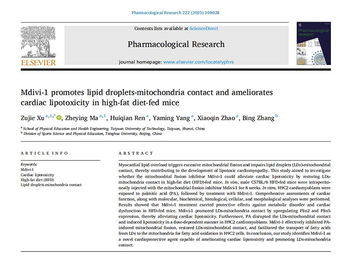 该研究聚焦于肥胖相关心肌病的关键病理机制心肌脂毒性,通过高脂饮食小鼠模型及棕榈酸处理的H9C2细胞实验,证实线粒体分裂抑制剂Mdivi-1可通过上调脂滴表面蛋白Plin2和Plin5表达,促进脂滴-线粒体相互作用,重建脂肪酸从脂滴储存向线粒体氧化的高效转运,恢复心肌脂肪酸氧化能力与ATP生成,减少脂质积累,改善心肌能量代谢及结构和功能损伤。该研究不仅揭示了心肌脂毒性的潜在治疗靶点,更为运动干预代谢性心肌病提供了理论依据和重要参考。