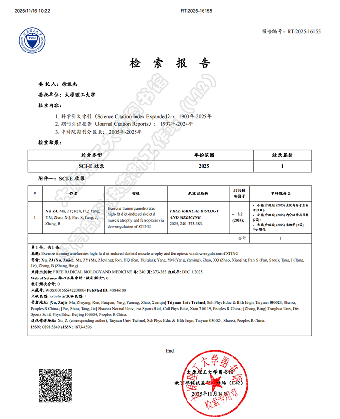 公司徐祖杰副教授的研究论文《Exercise training ameliorates high-fat diet-induced skeletal muscle atrophy and ferroptosis via downregulation of STING》在《Free Radical Biology and Medicine》期刊在线发表。《Free Radical Biology and Medicine》是自由基生物学与医学领域的国际权威期刊,专注于氧化还原生物学、自由基在生理与病理过程中的作用及其与疾病的关系,该期刊被SCIE(Science Citation Index Expanded)数据库收录,为JCR-Q1,中科院2区Top期刊,影响因子为8.2。公司教师徐祖杰副教授为该论文的第一作者和独立通讯作者,best365官网为第一署名单位。
