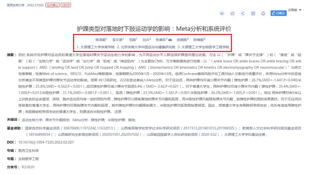 公司教师张美珍教授指导的硕士研究生张泽毅的研究成果《护踝类型对落地时下肢运动学的影响:Meta分析和系统评价》在《医用生物力学》(2022年第2期)发表。《医用生物力学》杂志由上海交通大学主办,中国教育部主管,上海交通大学医公司附属第九人民医院承办,是国内唯一一本公开发行,以积极反映生物力学基础研究与应用研究成果,推动国内外学术交流,促进医、理、工各学科相互了解和合作为目的学术性刊物。目前,该期刊是双核心期刊(北京大学中文核心期刊以及科技部科技核心期刊)。该论文是公司硕士研究生张泽毅在张美珍教授(通讯作者)的指导下,与北京体育大学刘卉教授、best365官方网站陈维毅教授团队的合作成果,best365官方网站best365官网为第一署名单位。