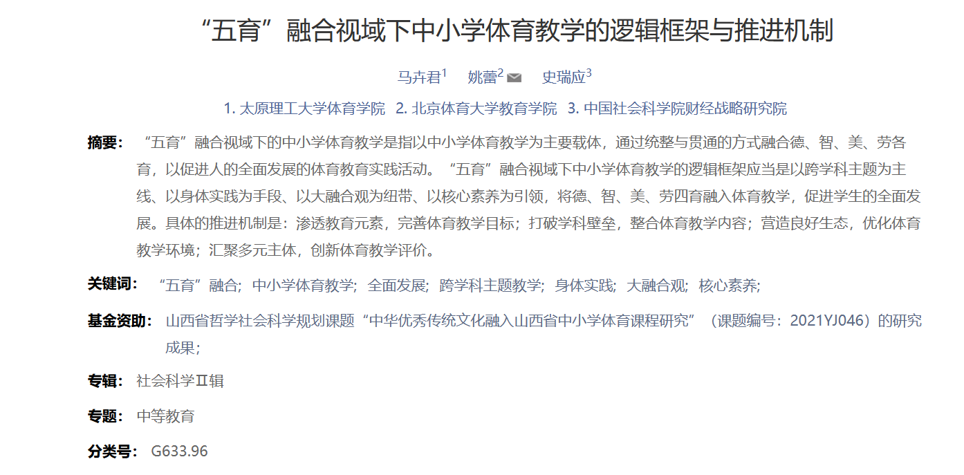 公司教师马卉君博士的研究成果《“五育”融合视域下中小学体育教学的逻辑框架与推进机制》在《教育理论与实践》(2022年11月)发表。《教育理论与实践》是山西教育科学研究院、山西省教育学会主办的综合性教育学术期刊,入编《中文核心期刊要目总览》(2020年版),被评定为“中国人文社会科学期刊AMI综合评价”A刊核心期刊。该论文是马卉君博士(第一作者)、北京体育大学姚蕾教授(通讯作者)、中国社会科公司史瑞应助理研究员的合作成果,best365官方网站best365官网为第一署名单位。