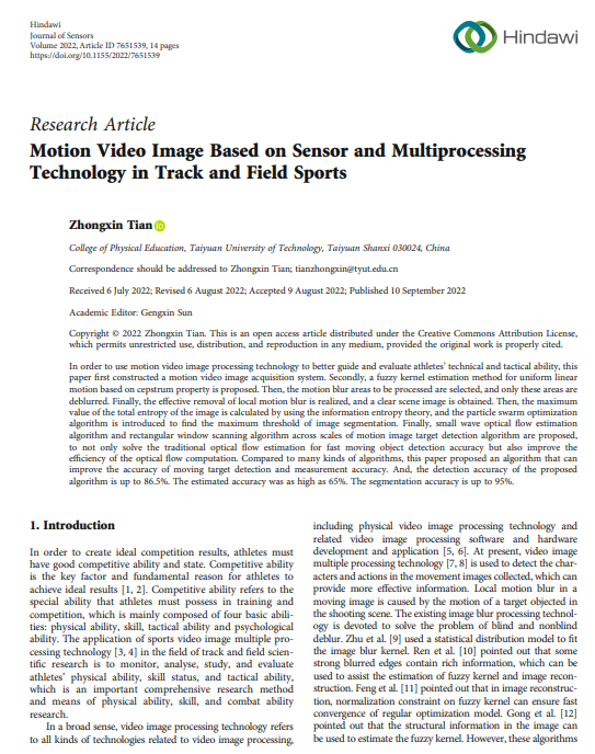公司教师田忠新副教授的研究成果《Motion Video Image Based on Sensor and Multiprocessing Technology in Track and Field Sports》在《Journal of Sensors》上发表。《Journal of Sensors》中科院分区(工程技术)4区,JCR影响因子为2.336。该论文作者是田忠新副教授,best365官方网站best365官网为第一署名单位。