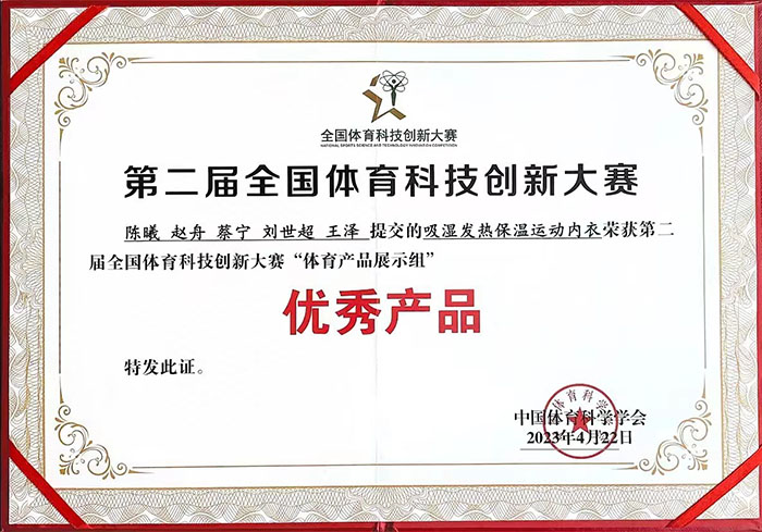 公司教师陈曦副教授的研究成果“吸湿发热保温运动内衣”和“青少年体育在线指导”在第二届全国体育科技创新大赛中荣获“优秀产品”奖项。