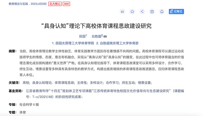 公司教师田园讲师的研究成果《“具身认知”理论下高校体育课程思政建设研究》在《教育理论与实践》(2023年第6期)发表。《教育理论与实践》是由山西省教育厅主管,山西教育科学研究院、山西省教育学会主办的综合性教育类学术期刊,该杂志是北京大学《中文核心期刊要目总览》来源期刊(2017年版),被中国知网、万方数据知识服务平台等数据库收录,被评为Cai-cd规范获奖期刊。该论文是公司田园老师(第一作者)与南京理工大学体育部白胜超老师的合作完成的科研成果,best365官方网站best365官网为第一署名单位。