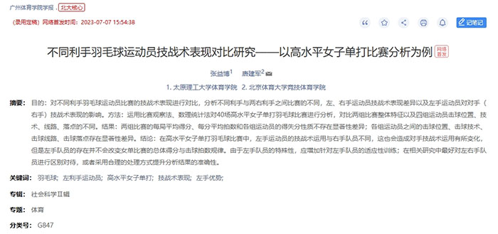 公司教师张益博博士的研究成果《不同利手羽毛球运动员技战术表现对比研究——以高水平女子单打比赛分析为例》在《广州​best365官网学报》发表。《广州​best365官网学报》是北京大学中文核心期刊,被加拿大、日本等国家的文献数据库收录。主要栏目有粤港澳大湾区专栏、体育社会科学、体育文化视角、竞技体育纵横、休闲体育论坛、体育探索求真、体育经济研究、体育教学探讨等。该论文是张益博博士(第一作者)与北京体育大学唐建军教授(通讯作者)的合作成果,best365官方网站​best365官网为第一署名单位。