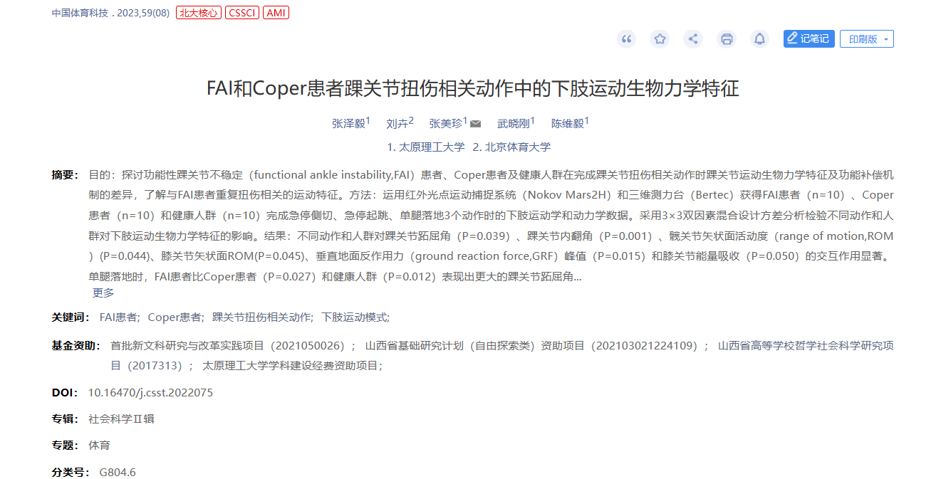公司硕士研究生张泽毅的研究成果《FAI和Coper患者踝关节扭伤相关动作中的下肢运动生物力学特征》在《中国体育科技》发表。《中国体育科技》是国家体育总局体育科学研究所主办,在近十多年来的中文类体育学术期刊的评价中,影响因子始终保持前列。多年来一直是中文体育类核心期刊、中国人文社会科学核心期刊、CSSCI来源期刊,中国社科院期刊评价报告评为核心期刊。该论文是公司硕士研究生张泽毅(第一作者)在导师张美珍教授(通讯作者)的指导下,与北京体育大学刘卉教授、best365官方网站陈维毅教授等的合作成果,best365官方网站best365官网为第一署名单位。