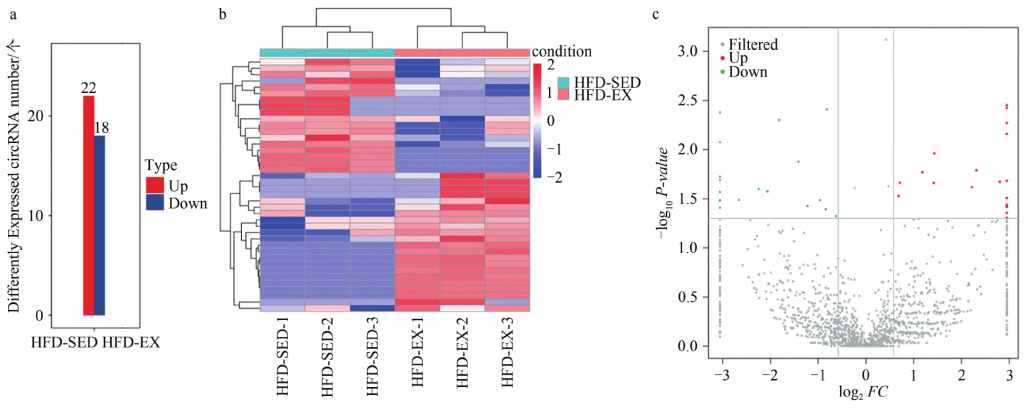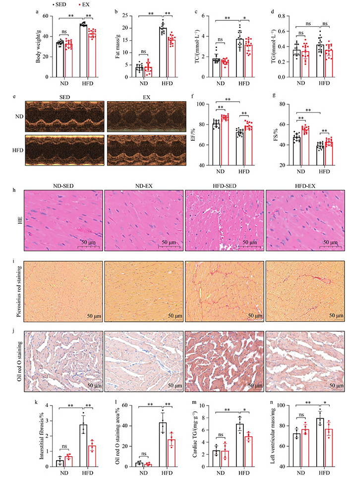 该研究通过甲基化RNA免疫沉淀测序(MeRIP-seq)和转录组测序(RNA-seq)绘制N6-甲基腺苷(m6A)修饰图谱,探讨了环状RNA(circRNAs)m6A甲基化修饰在有氧运动改善高脂饮食小鼠心脏病理性重塑中的作用。结果表明,有氧运动显著降低高脂饮食小鼠体重和体脂含量,提高左心室射血分数(EF)和短轴缩短率(FS),抑制心脏纤维化和脂质沉积,改善心脏病理性重塑。有氧运动可以显著降低高脂饮食小鼠心脏m6A甲基化水平,调节心脏circRNAs表达谱和m6A修饰谱。因此,circRNA_4614介导的m6A修饰在有氧运动改善肥胖性心脏重塑中可能发挥重要作用。