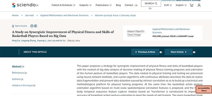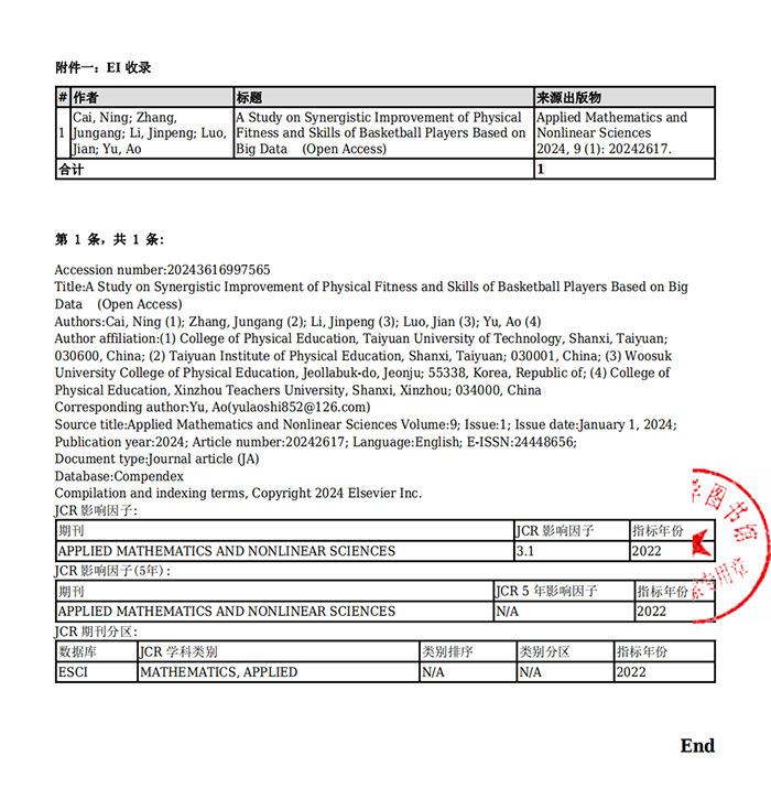 公司教师蔡宁老师的研究成果《A Study on Synergistic Improvement of Physical Fitness and Skills of Basketball Players Based on Big Data》在《Applied Mathematics and Nonlinear Science》发表。《Applied Mathematics and Nonlinear Science》是一本专注于发表用数学和非线性科学的方法来解决体育等领域原创研究的学术期刊。期刊接受基于分析、计算和实验方法的综述文章和原创贡献,致力于发表高质量的短论文、常规论文和阐释性论文,该期刊为EI期刊。该论文是公司教师蔡宁老师(第一作者)的研究成果,best365官方网站best365官网为第一署名单位。