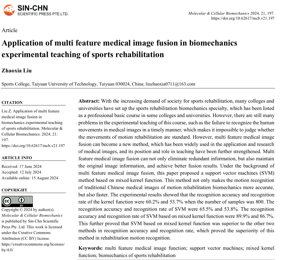 随着社会对运动康复的需求不断增加,而传统医学图像无法识别人体运动,该论文在多特征医学图像融合的背景下,提出了一种基于混合核函数的支持向量机(SVM)方法。经研究表明,多特征医学图像融合技术在运动康复生物力学实验中的应用,不仅提高了运动识别的准确性和速度,而且显著提高了教学效果。